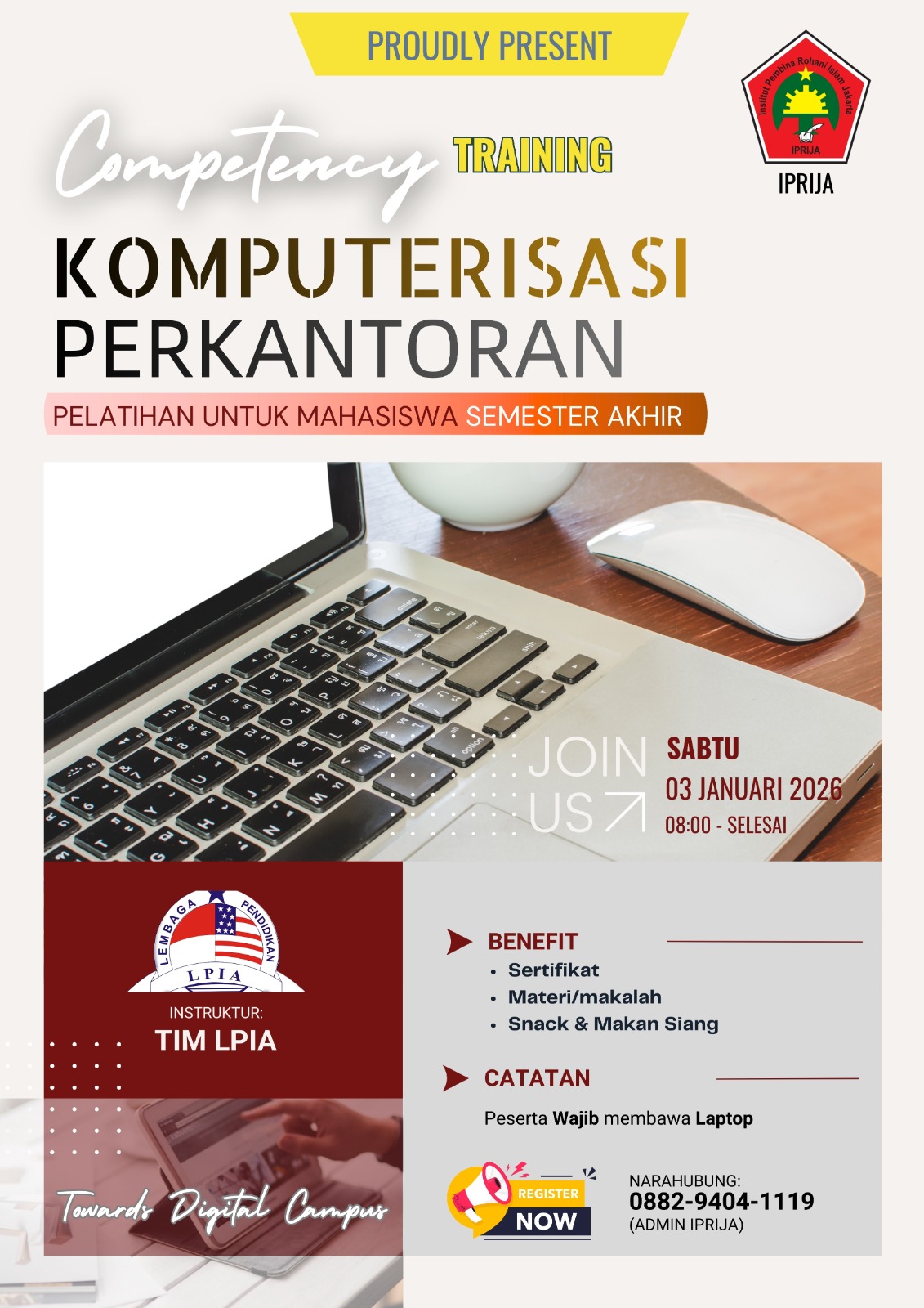 Stadium General 2019 dengan Tema "Meningkatkan Kualitas Mahasiswa dan Lulusan IPRIJA yang Berakhlaqul Karimah dan Unggul Menghadapi Era Revolusi Industri 4.0" dengan Narasumber : Tanenji, S.Ag.,MA.